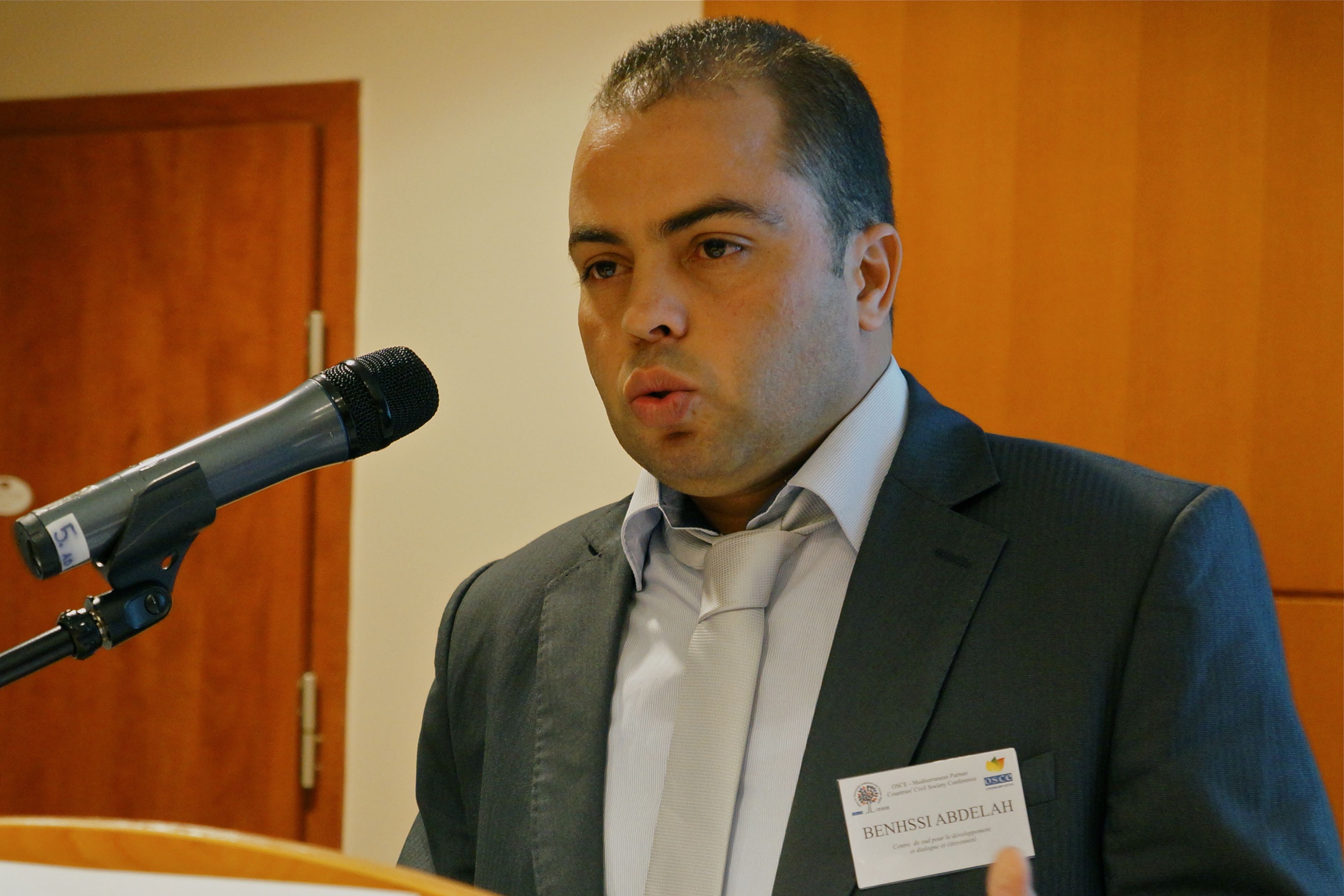 Abdellah Benhssi, the President of the Morocco-based Centre de Sud pour le Développement et Dialogue et Citoyenneté (Centre of the South for the Development of Dialogue and Citizenship) addresses participants at a side event on tolerance and non-discrimination in democracies in transition, held during the OSCE-Mediterranean Partner Countries’ Conference for Civil Society, Vilnius, Lithuania, 5 December 2011.