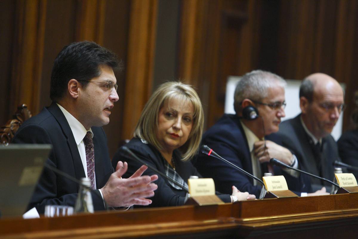 Janez Lenarčič, Director of the OSCE Office for Democratic Institutions and Human Rights (ODIHR) speaks at the presentation of an assessment report on the lawmaking and legislative process in the Republic of Serbia, Belgrade, 7 February 2012.