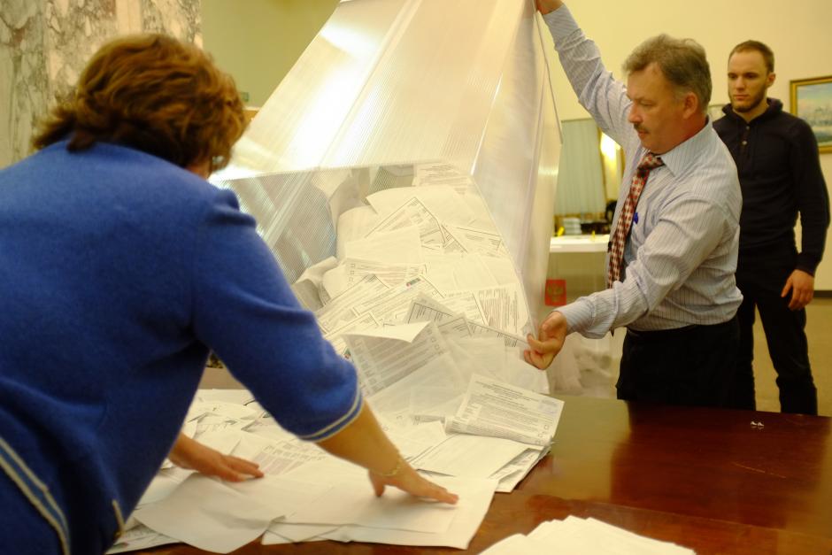 A ballot box is emptied at a Moscow polling station ahead of counting in Russia's Presidential election, 4 March 2012.