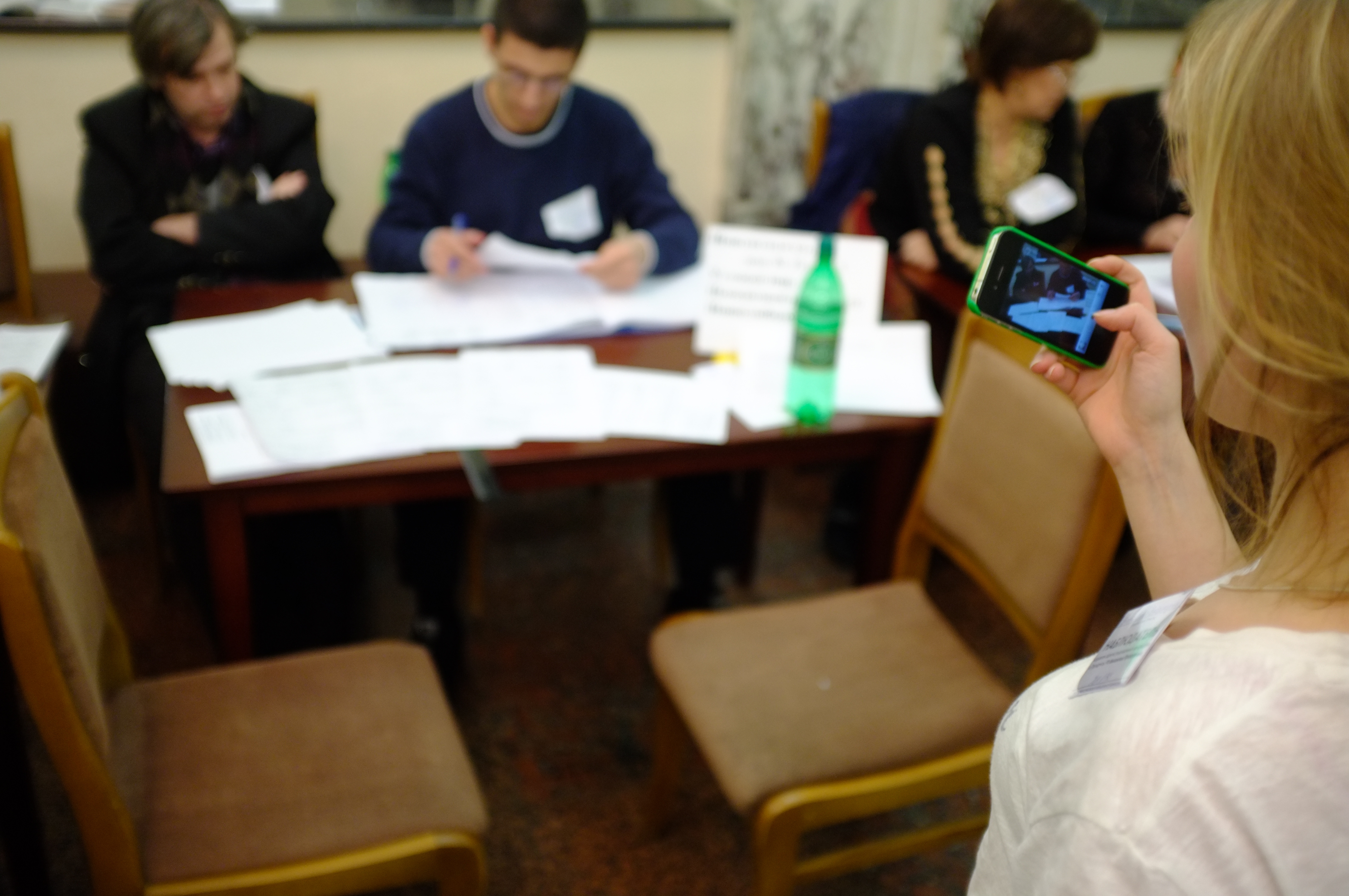 A domestic election observation films the work of the election commission at a polling station in Moscow during Russia's Presidential election, 4 March 2012.