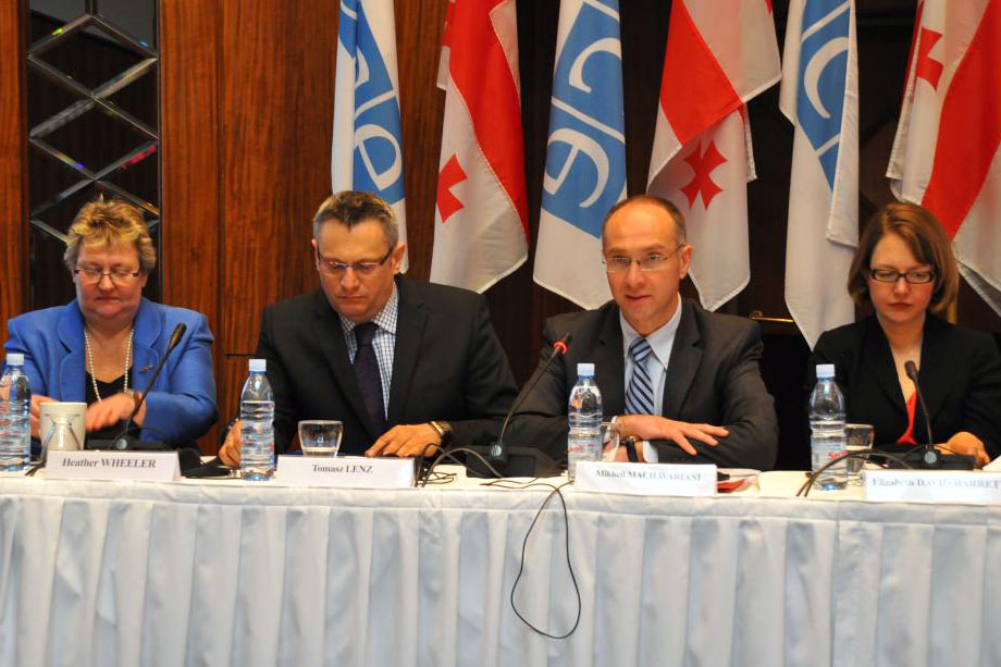 (L-r) Heather Wheeler, Member of Parliament from the United Kingdom; Tomasz Lenz, Member of Parliament from Poland; Mikheil Machavariani, First Deputy Speaker of the Parliament of Georgia, and Dr. Liz David-Barrett of the University of Oxford, at the opening session of an ODIHR conference on codes of ethics for parliamentarians, Tbilisi, Georgia, 19 April 2012.
