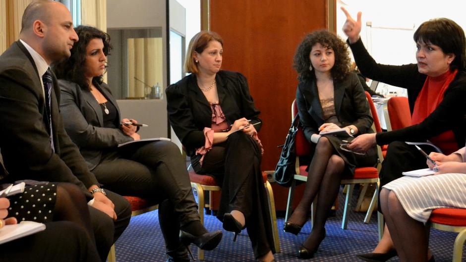 Participants discuss how women can strengthen their political campaigning capacities at a seminar co-organized by ODIHR on increasing women’s participation in political parties in Georgia. Tbilisi, 26 April 2012.