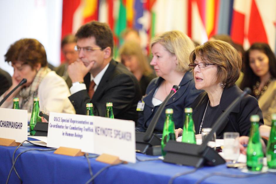 (L-r) ODIHR Director, Ambassador Janez Lenarčič and Martina Feeny, Deputy Head of the Permanent Mission of Ireland to the OSCE, listen as Maria Grazia Giammarinaro, OSCE Special Representative and Co-ordinator for Combating Trafficking in Human Beings, delivers the keynote address at the Human Dimension Seminar on ways to strengthen the rule of law to combat human trafficking. Warsaw, 14 May 2012.