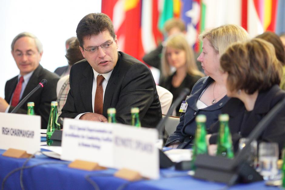 Former ODIHR Director Janez Lenarčič (l) speaks to Martina Feeny, Deputy Head of the Permanent Mission of Ireland to the OSCE (c) and Maria Grazia Giammarinaro, OSCE Special Representative and Co-ordinator for Combating Trafficking in Human Beings (r), at the start of the three-day Human Dimension Seminar on ways to strengthen the rule of law to combat trafficking in human beings. Warsaw, 14 May 2012.