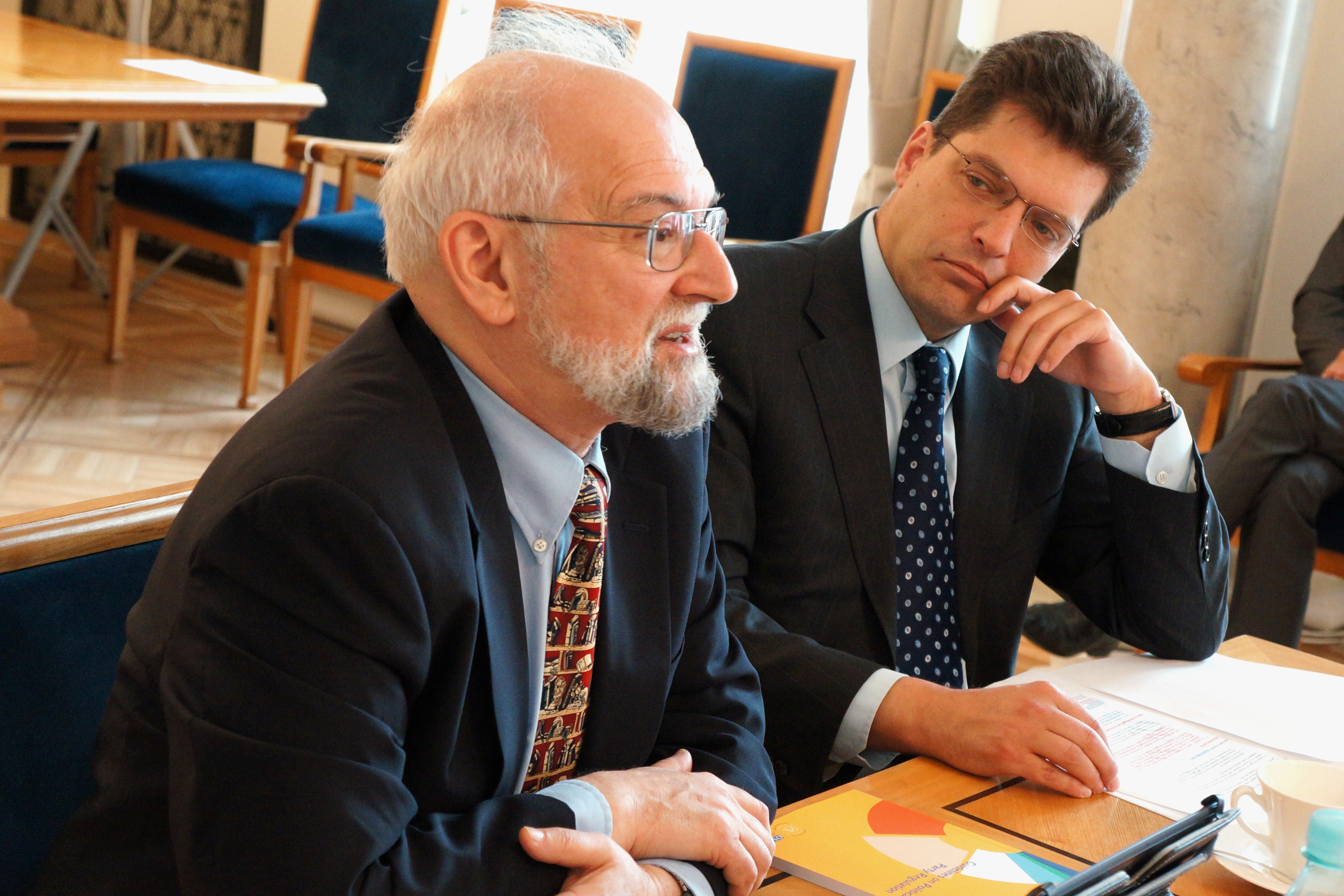 ODIHR Director, Ambassador Janez Lenarčič (r) listens as Richard Katz, the Chairperson of the OSCE/ODIHR Core Group of Experts on Political Parties, addresses the annual meeting of the Group, Warsaw, 17 May 2012.