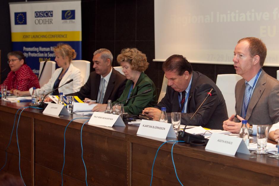 (L-r) Lida Kita from the European Training Foundation; Sarah Keating from the Directorate of Democratic Citizenship and Participation at the Council of Europe; Andrzej Mirga, ODIHR’s Senior Adviser on Roma and Sinti Issues; Judith Kiers, Best Practices in Roma Integration (BPRI) Project Manager, and Ralf-René Weingärtner, Director of Human Rights and Anti-Discrimination at the Council of Europe, listen as Kjartan Björnsson from the Directorate General for Enlargement at the European Commission speaks at the launch of BPRI, Budva, 27 June 2012.
