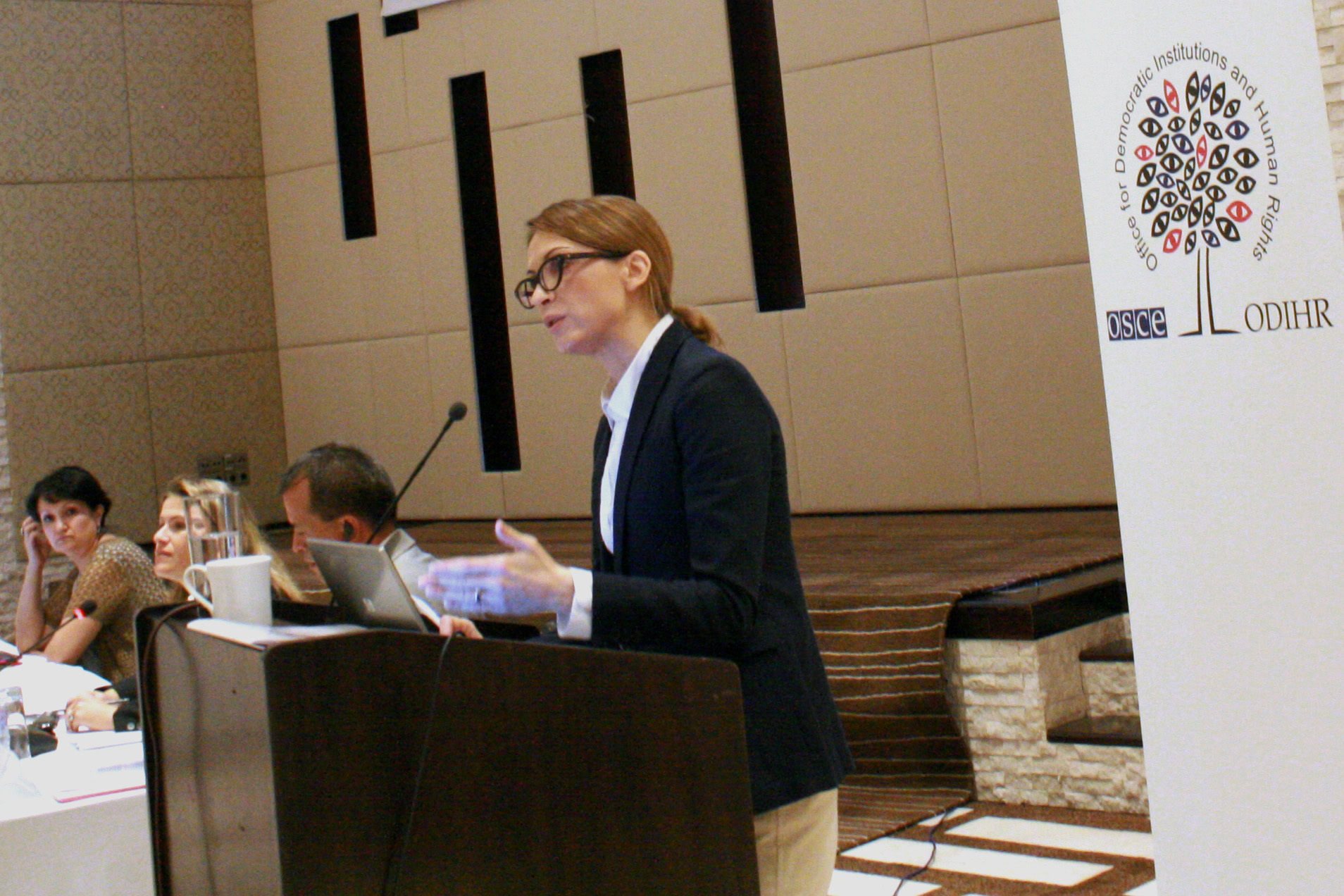 (L-r) Alla Kuvatova, gender expert; Nathalie Tagwerker, Deputy Head of ODIHR’s Democratization Department, and Rustam Mirzoev from the Executive Apparatus of the President of the Republic of Tajikistan, listen as Dace Schlentz, ODIHR’s Migration and Freedom of Movement Adviser presents ODIHR’s report on the challenges facing women from migrant households in Tajikistan. Dushanbe, 12 September 2012.