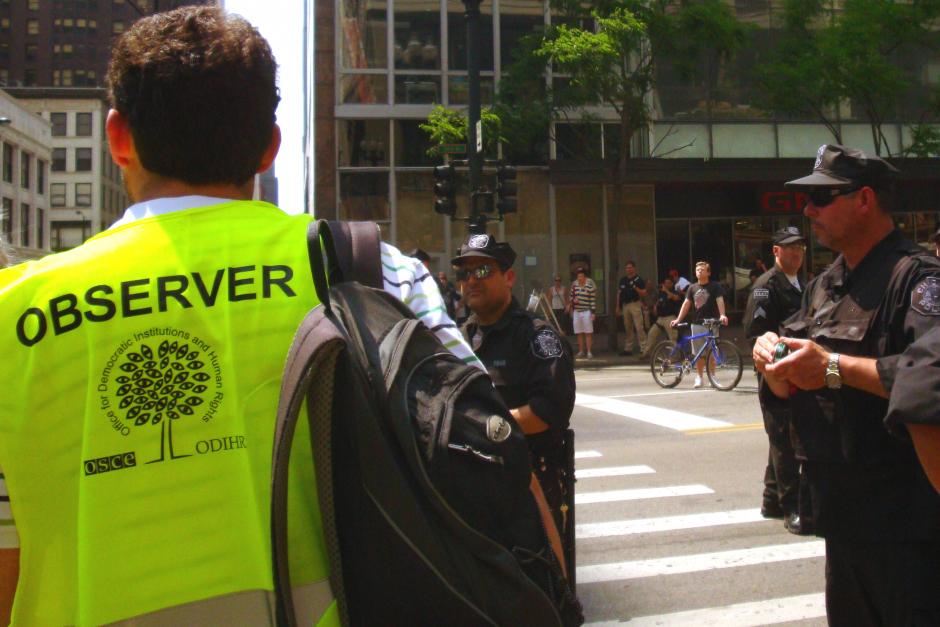 An OSCE/ODIHR observer monitors an assembly during the NATO Summit in Chicago, 20 May 2012.