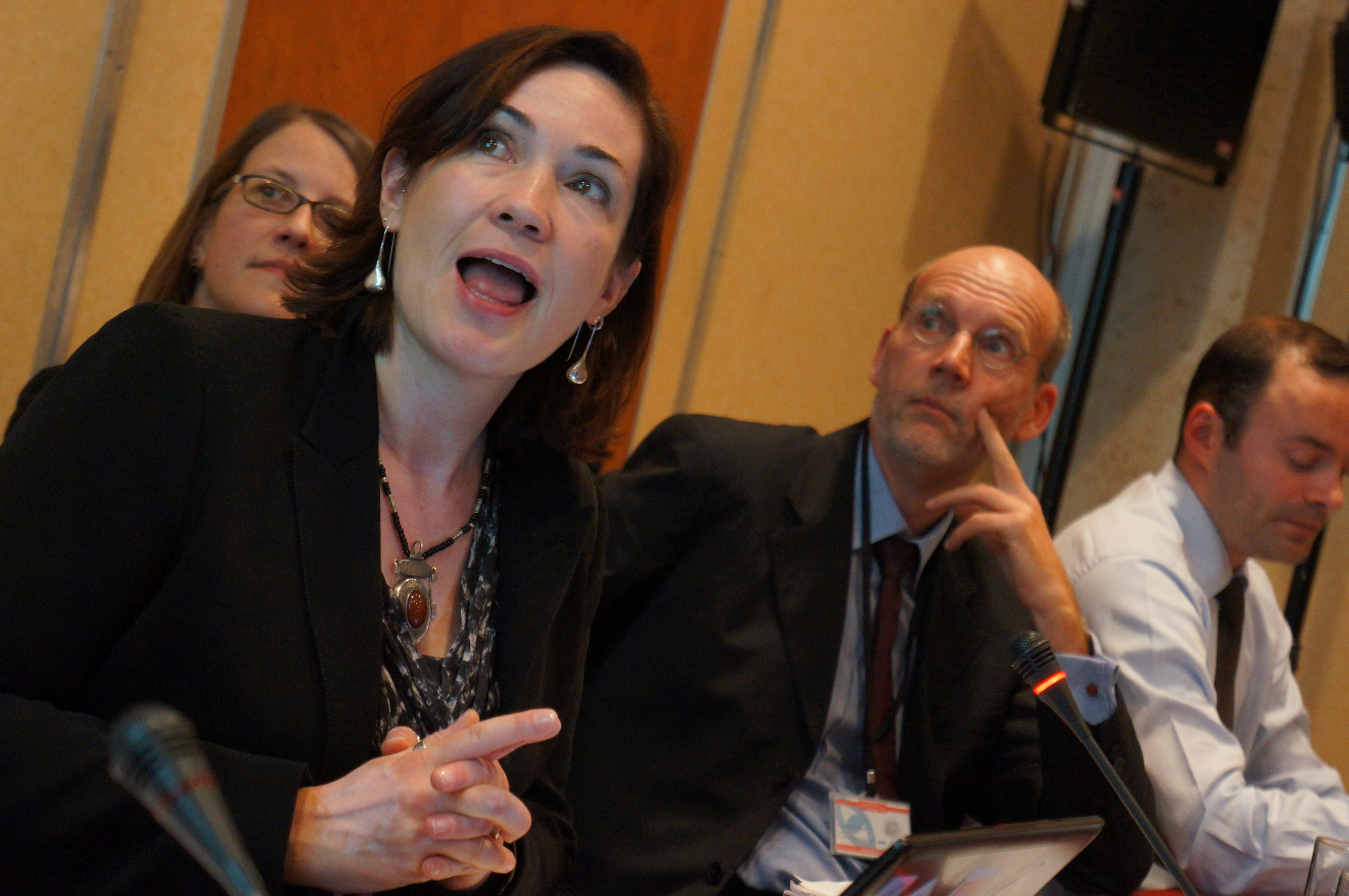 Thomas Vennen (r), Head of ODIHR’s Democratization Department, and Alice Thomas, Acting Chief of ODIHR’s Legislative Support Unit, listen as Helen Darbishire of the organization Access Info Europe addresses participants of a session on promoting free access to information, which took place during Human Dimension Implementation Meeting, Warsaw, 25 September 2012.