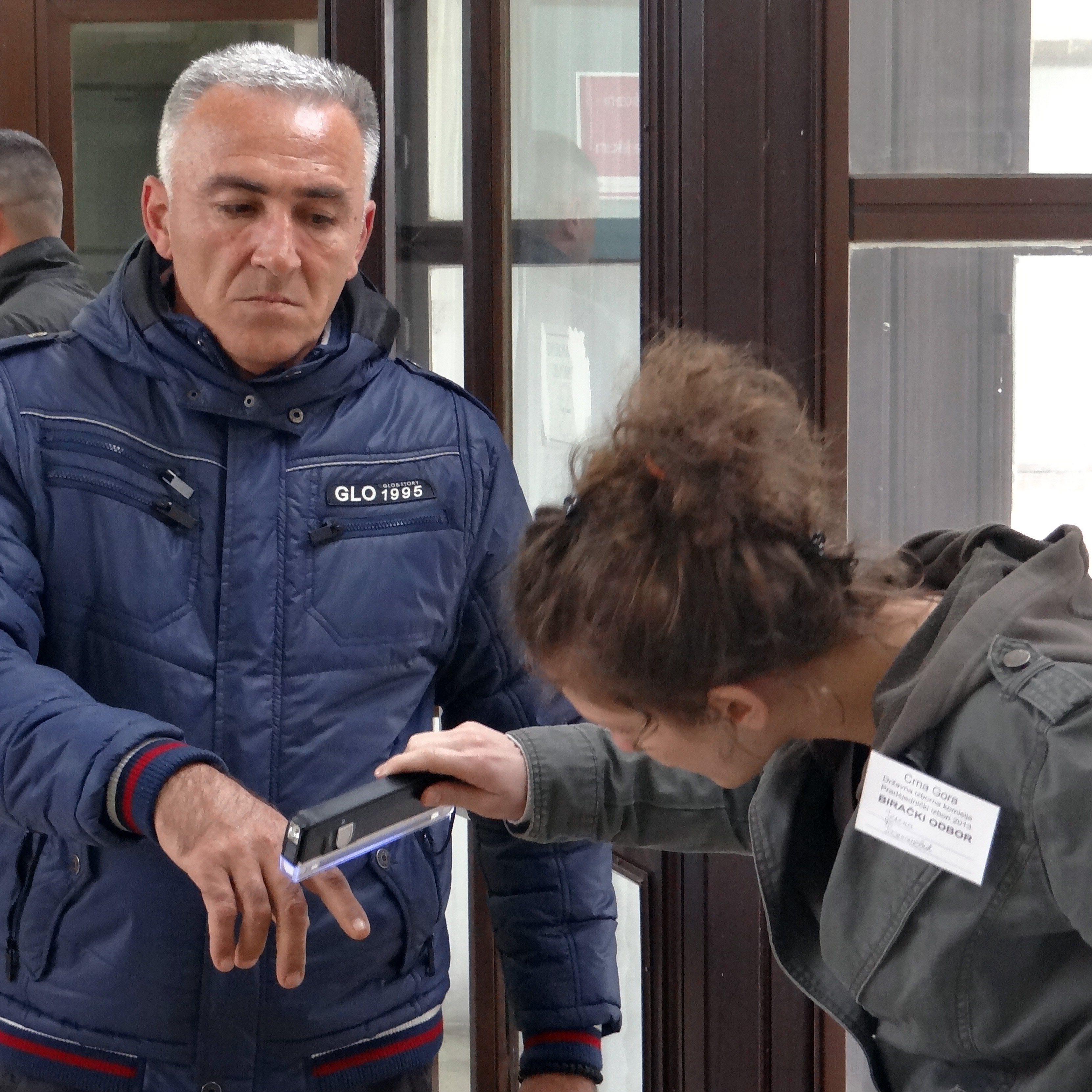 A polling station official examines a voter's hand for invisible ink in Podgorica during the presidential election in Montenegro, April 7 2013. The ink is applied to the index fingers of voters as a measure to ensure against multiple voting.