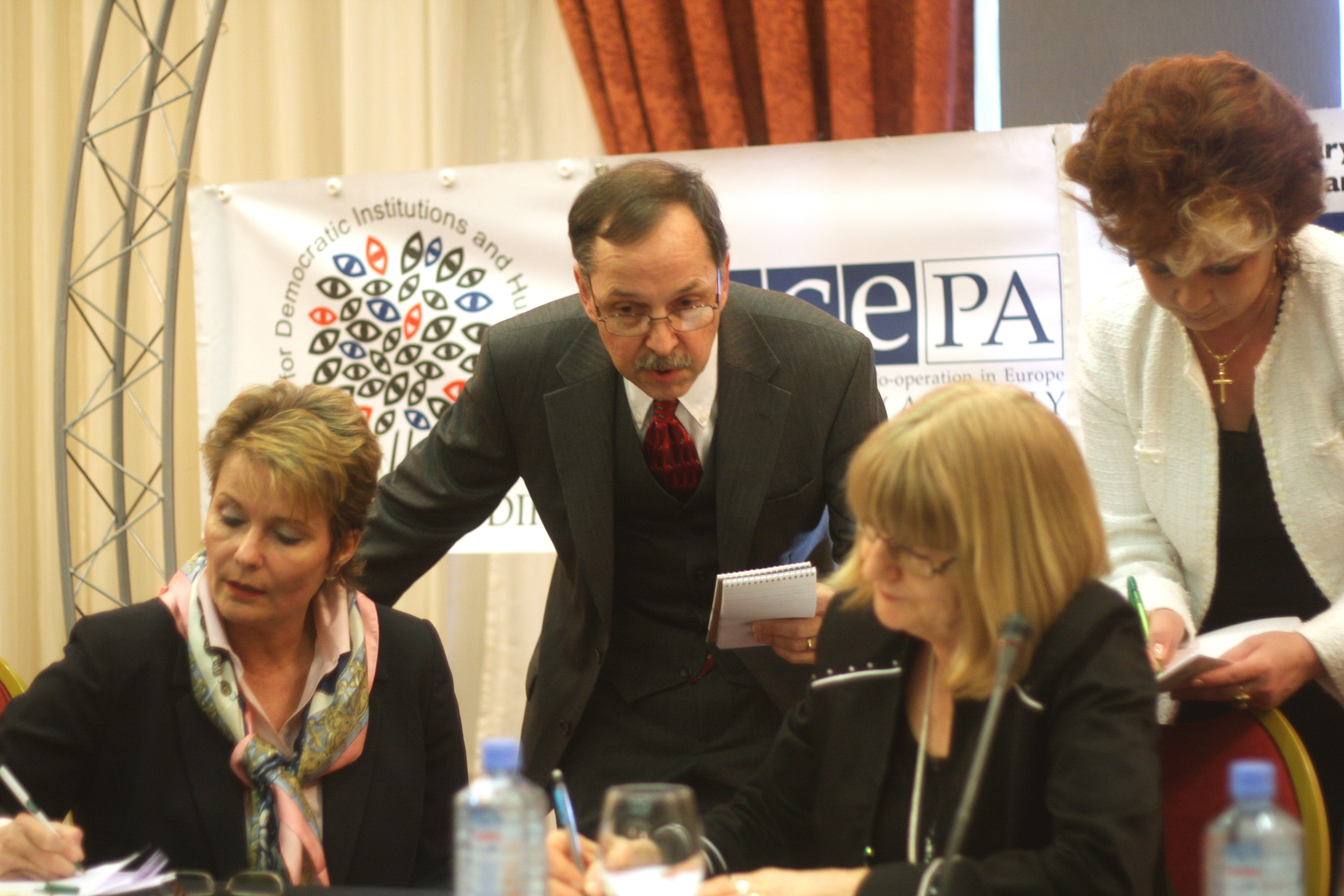 Pia Christmas-Møller, OSCE Parliamentary Assembly Vice-President and Special Coordinator of the short-term observers (left) and Peter Eicher, head of the OSCE/ODIHR long-term observation mission, before their post-election press conference, 23 March 2009.