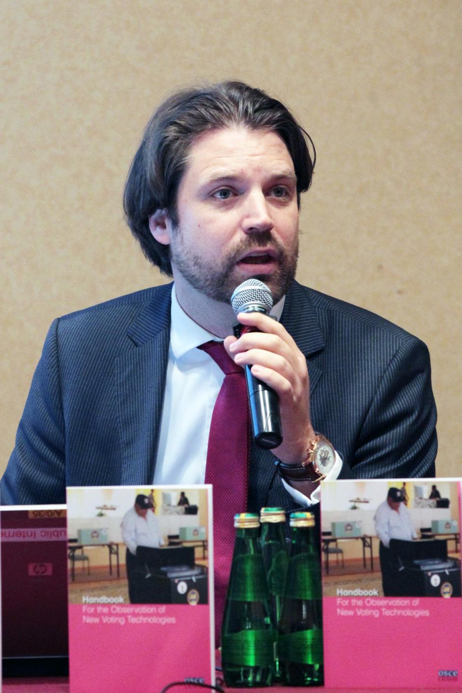 Robert Krimmer, ODIHR’s Senior Adviser on New Voting Technologies, presents the new "Handbook for the Observation of New Voting Technologies" at the Human Dimension Implementation Meeting, Warsaw, 1 October 2013.
