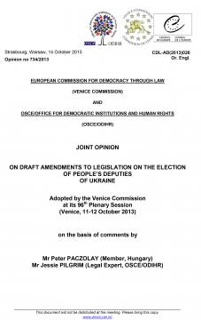 In April 2013, the Minister of Justice of Ukraine, Mr. Oleksandr Lavrynovych, requested the Venice Commission and the OSCE/ODIHR to comment on the text of the draft laws regulating parliamentary elections, including a draft law for holding repeat elections for the constituencies where results had not been established in the 2012 parliamentary elections. In response to this request, the Venice Commission and the OSCE/ODIHR reviewed the draft amendments, and on 17 June 2013, the Venice Commission and the OSCE/ODIHR provided a written joint opinion on the draft legislation.