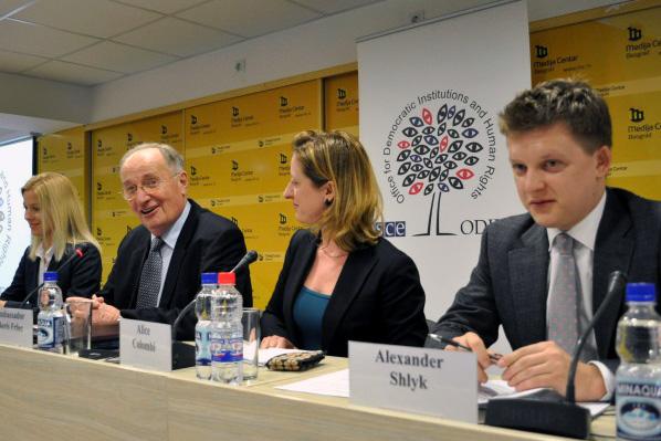 Ambassador Boris Frlec (second from left) introducing the OSCE/ODIHR Limited Election Observation Mission for the 16 March early parliamentary elections at the mission's opening press conference in Belgrade,13 February 2014.