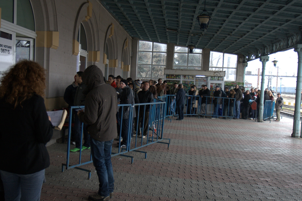 Voters stand in line in front of a special polling station at a train station in Bucharest during the second round of the Romanian presidential elections, 6 December 2009