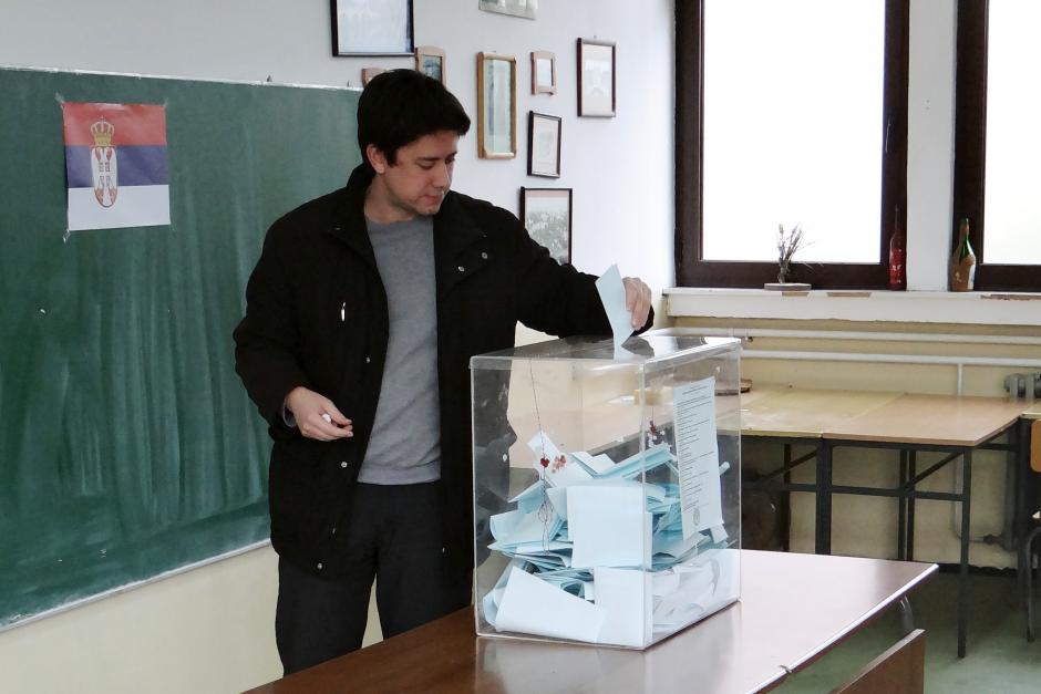A voter casting his ballot at a polling station in the city of Topola during Serbia's early parliamentary elections, 16 March 2014.