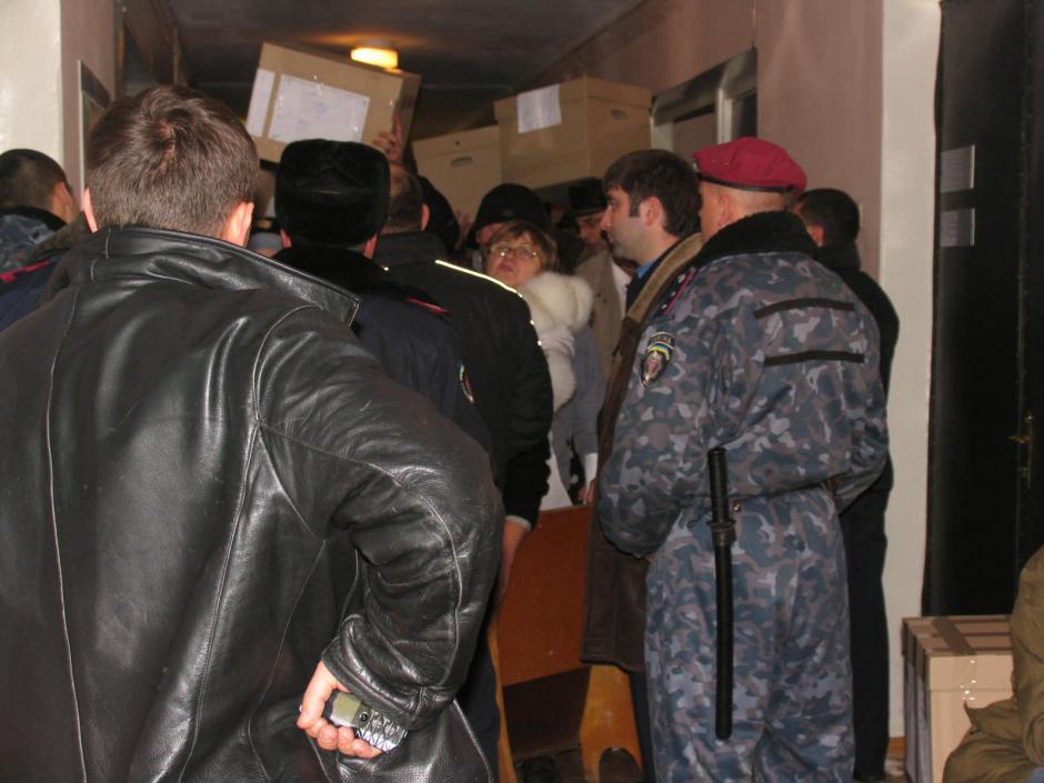 Precinct election commission officials with boxes of counted votes cast in the second round of the Ukrainian presidential election, Simferopol, 8 February 2010.
