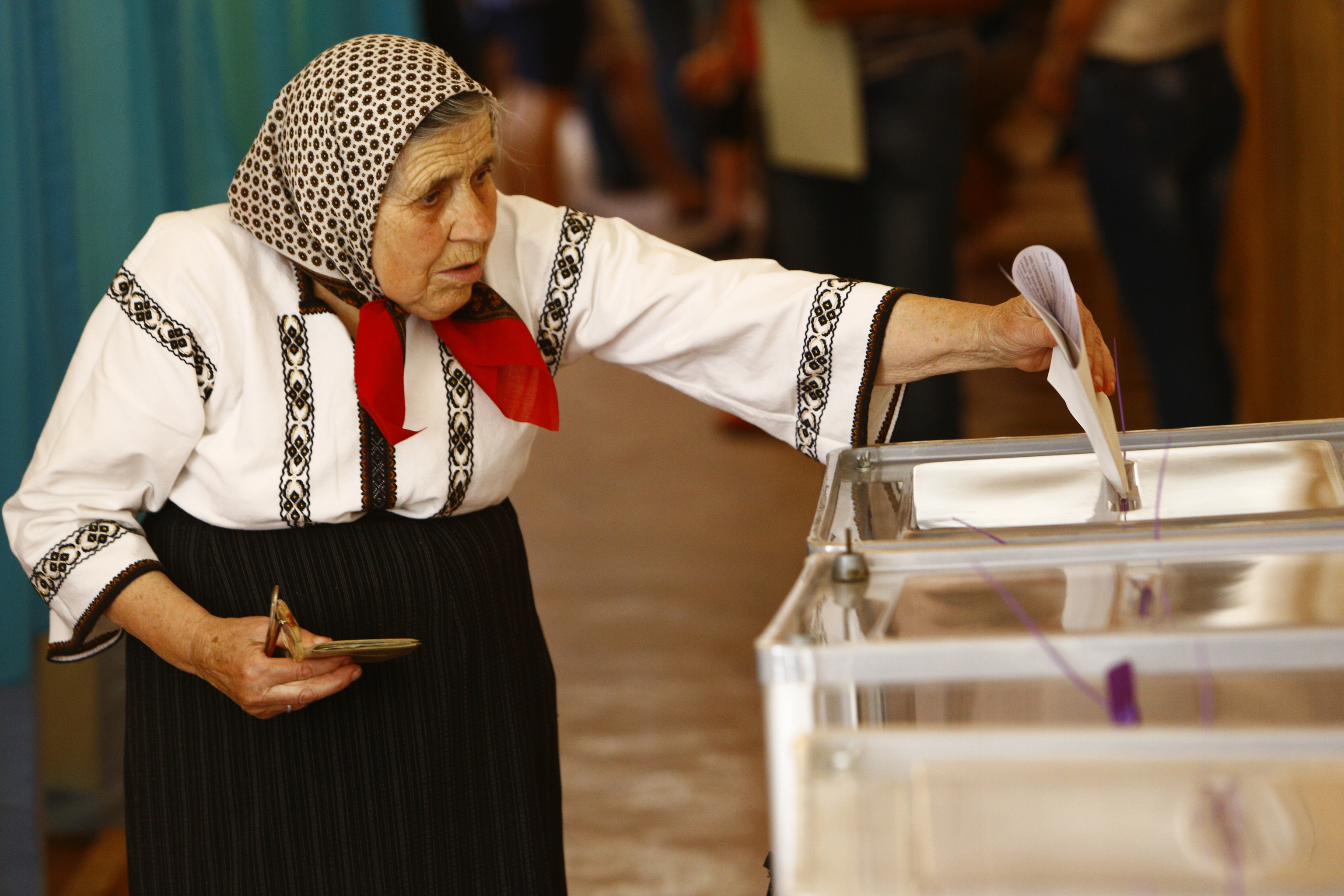 85-year old voter in Krasnoilsk, Chernivitsi region in Ukraine casts her vote during the early Presidential elections, 25 May, 2014.