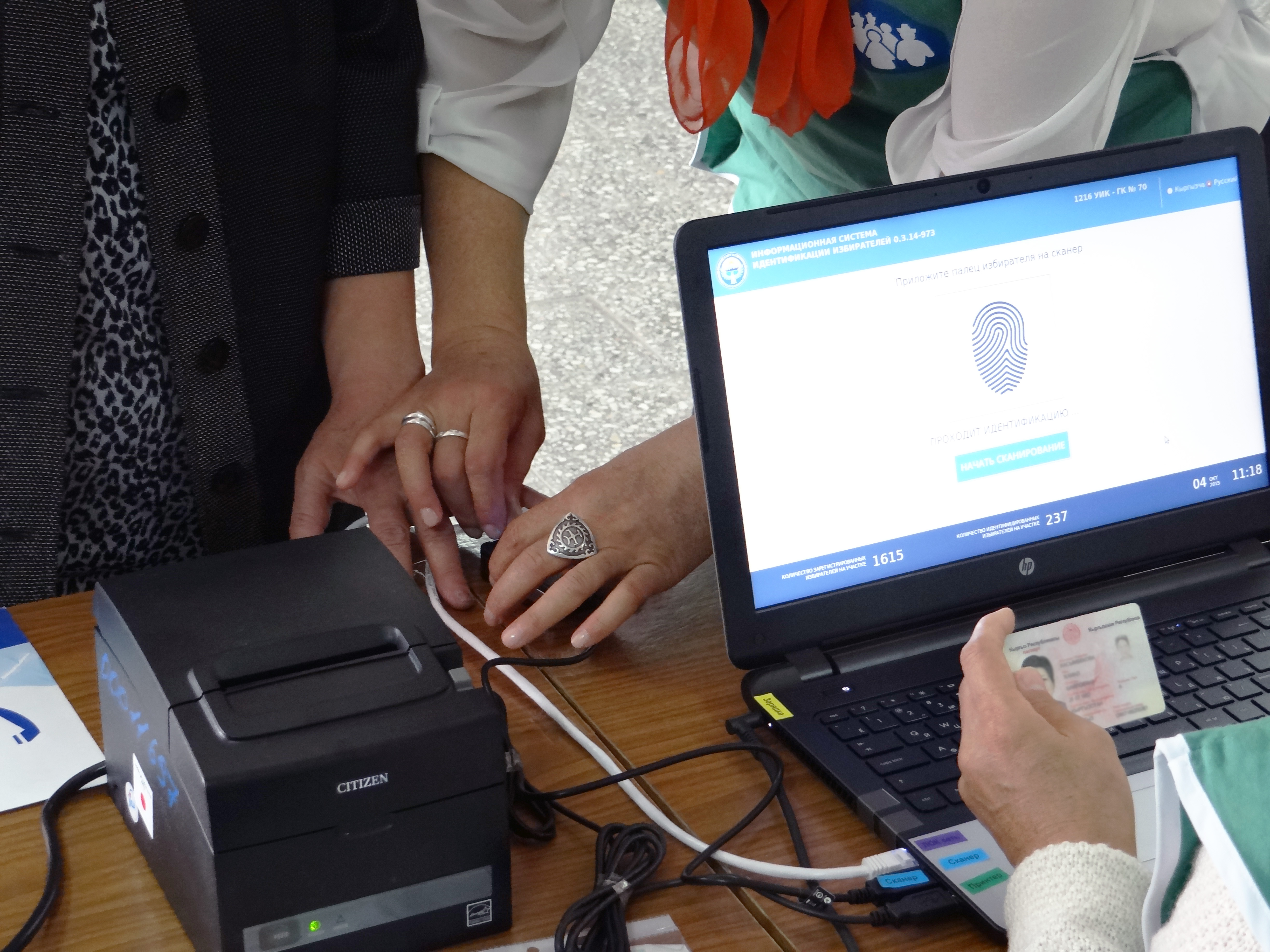 A voter's finger being scanned at a polling station in Bishkek during Kyrgyzstan's parliamentary elections on 4 October, 2015. A new biometric voter identification system was first used in these elections.