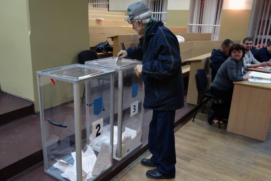 A voter casting his ballot during the second round of the mayoral election in Kyiv, 16 November 2015.