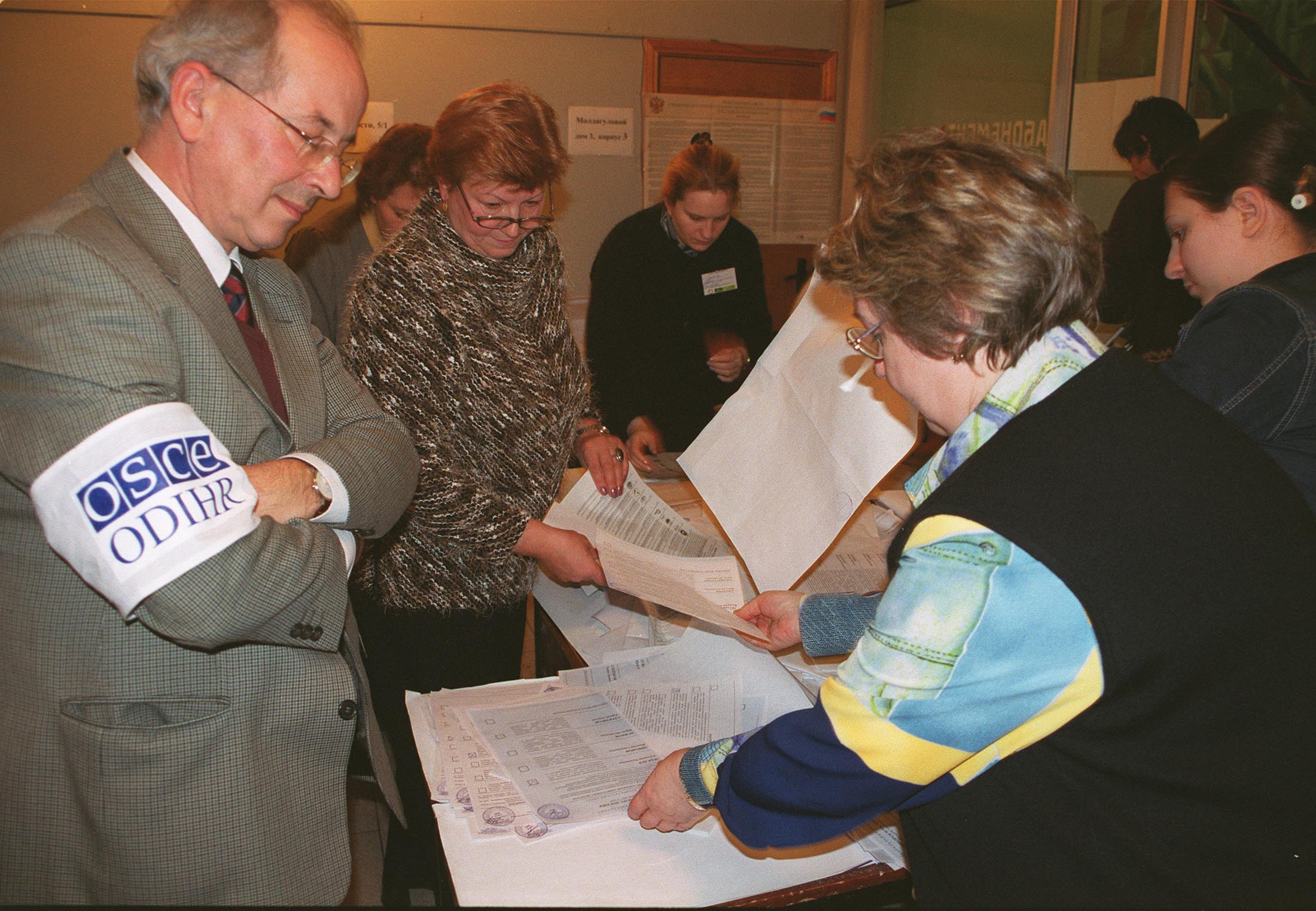 An OSCE observer watches officials count ballots after the polling station closed in Moscow, 7 December 2003. Russia held elections for the State Duma, the lower house of parliament.