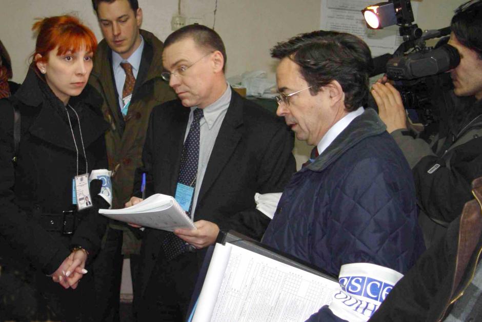 ODIHR Director Christian Strohal (right) and Craig Jenness, Head of the ODIHR Election Observation Mission, at a polling station during Georgia's presidential election, 4 January 2004.