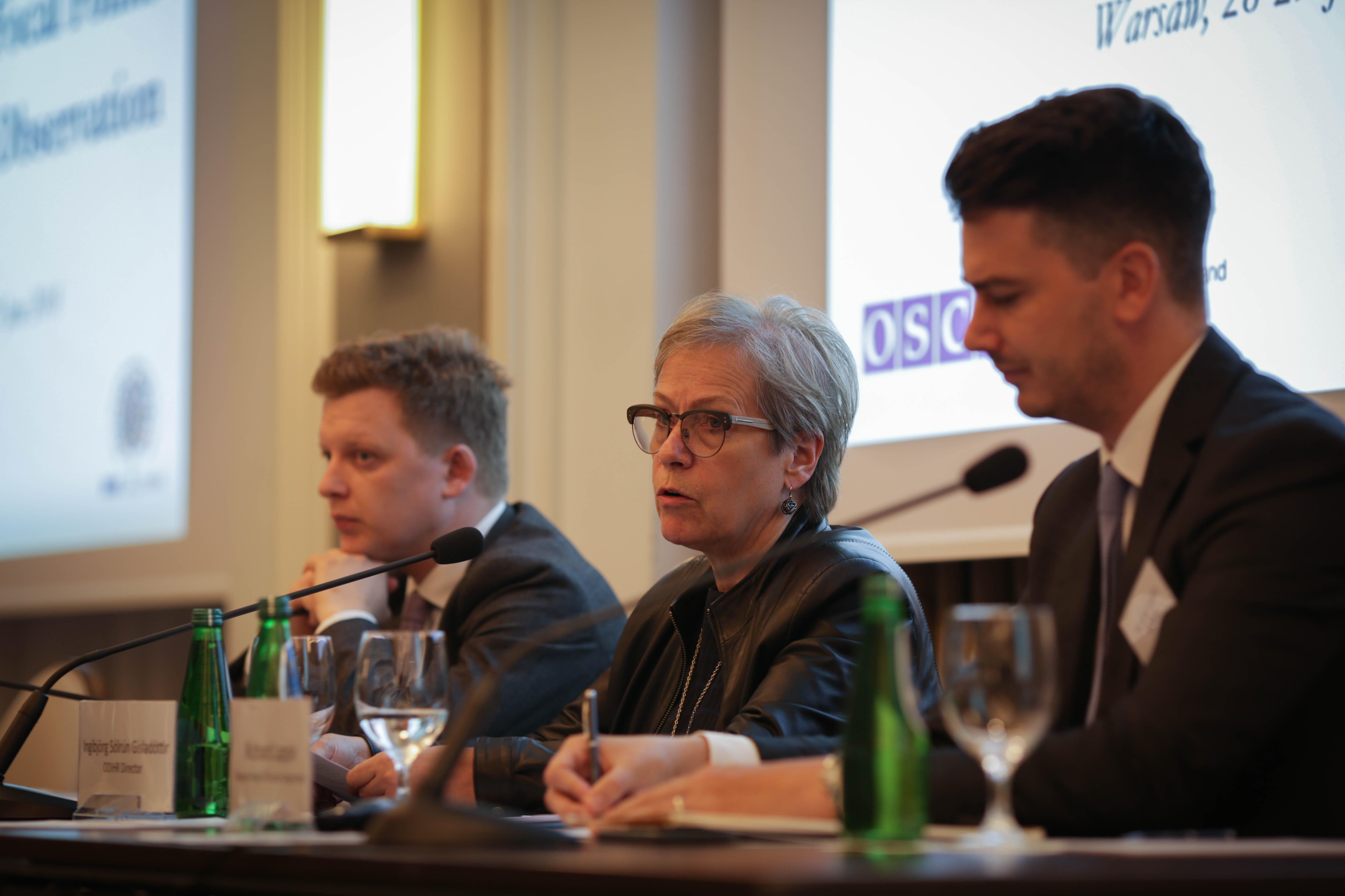 Ingibjörg Sólrún Gísladóttir, Director of the OSCE Office for Democratic Institutions and Human Rights (ODIHR), addressing participants in a meeting of national focal points for election observation organized by ODIHR. In the background is Alexander Shlyk, Head of ODIHR Elections Department; in the foreground is Richard Lappin, Deputy Head of the department. Warsaw, 28 June 2018