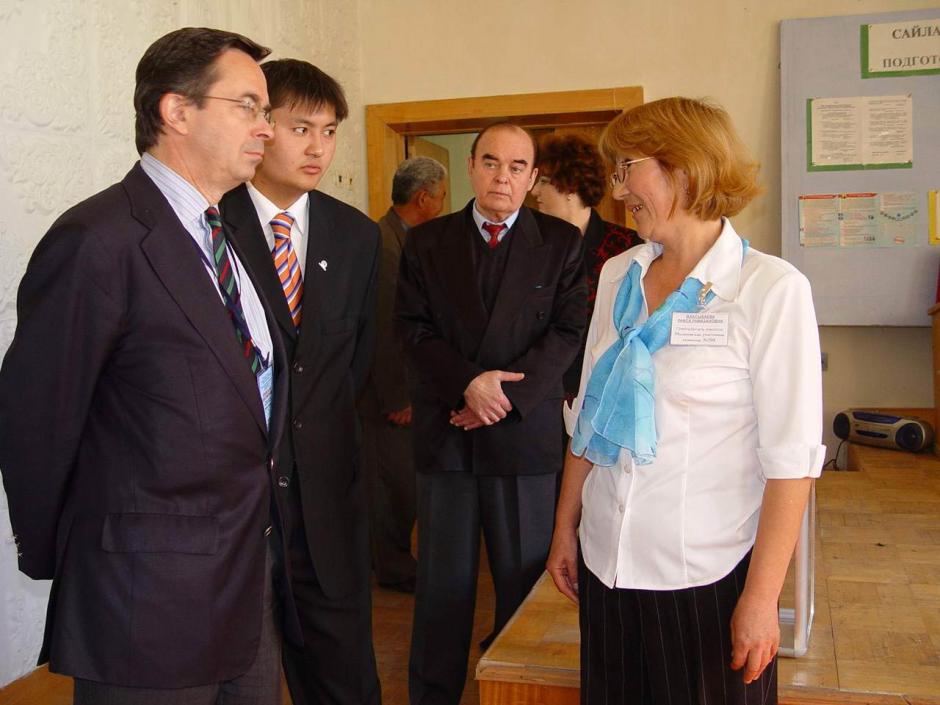 ODIHR Director Amb. Christian Strohal (left) meets the chairwoman of a polling station in Malinovka during parliamentary elections in Kazakhstan, 19 September 2004.
