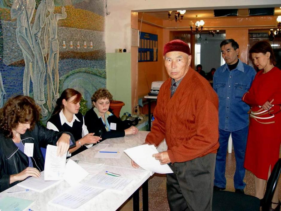 A voter in the Kazakh capital of Astana collects his ballot from election officials during parliamentary elections on 19 September 2004.