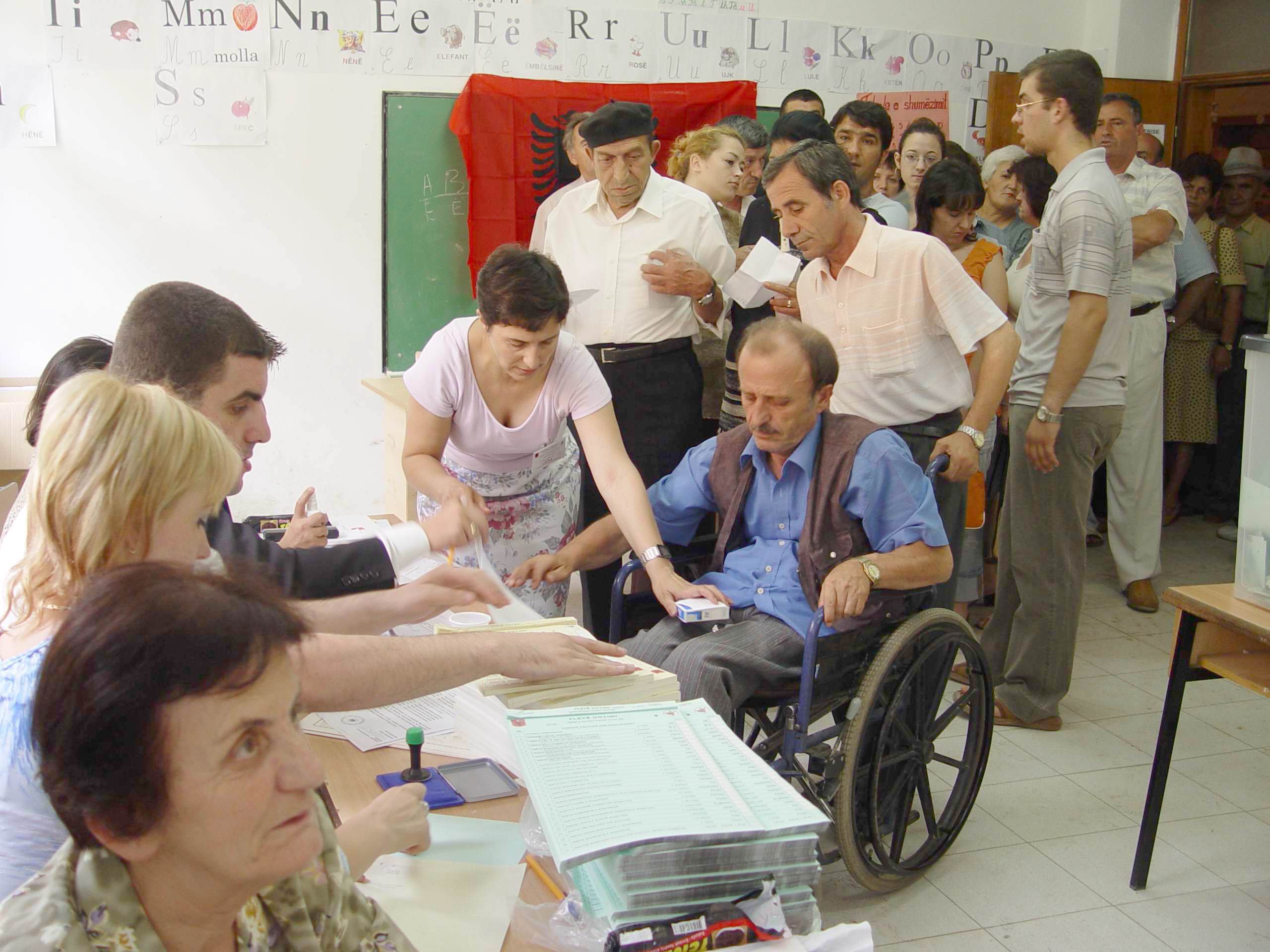 Voters line up to cast their ballots at a polling station in Tirana during parliamentary elections in Albania, 3 July 2005.