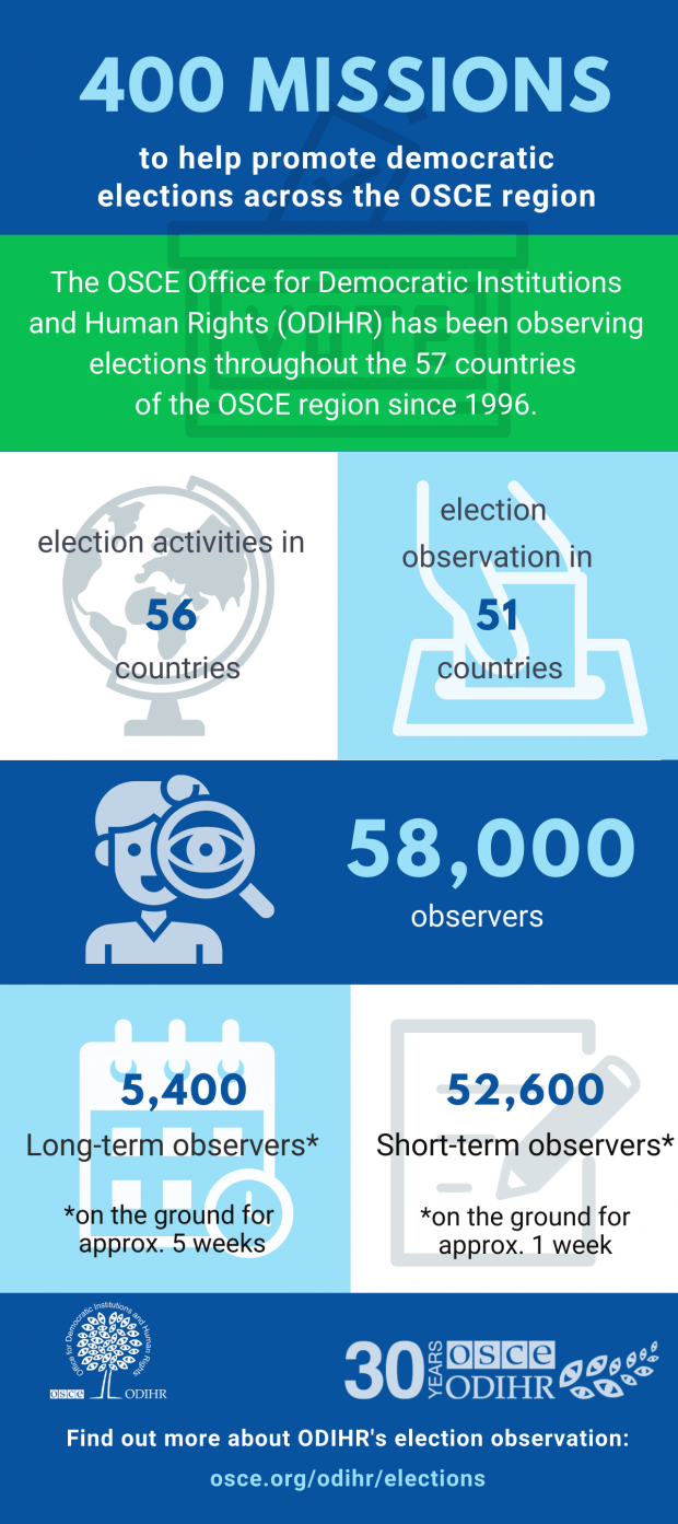 The OSCE Office for Democratic Institutions and Human Rights (ODIHR) has been observing elections throughout the OSCE region since 1996. The Office offers support and recommendations to participating States on ways to improve the conduct of elections in line with OSCE commitments and other international standards for democratic elections.