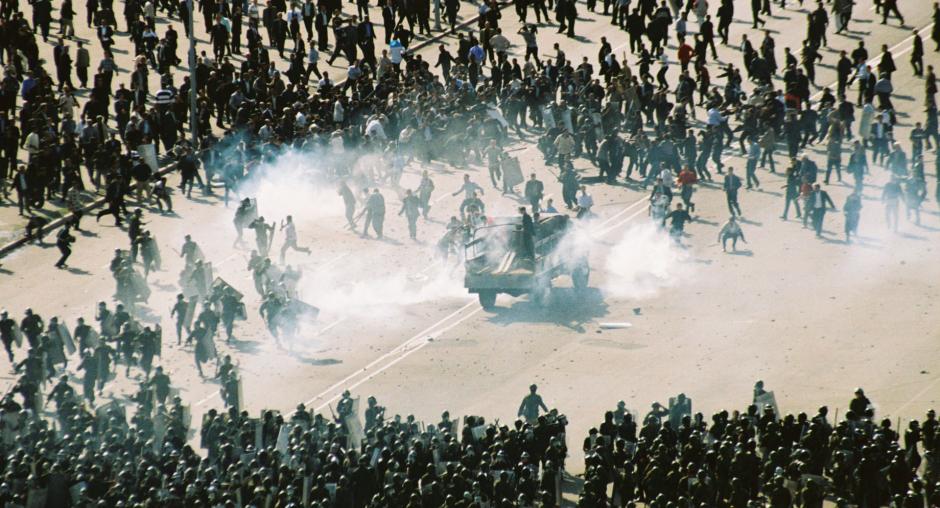 (OSCE/Astrid Senheitel)Protesters took over an interior ministry truck and ran over several police officers during clashes in Baku's Azadliq Square on 16 October 2003, the day after presidential election. (OSCE/Astrid Senheitel) Photo details