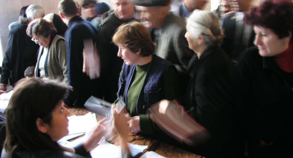 (OSCE/Cliff Volpe)Inside the polling station, local residents complete the steps necessary to vote, Bolnisi, Georgia, 2 November 2003. (OSCE/Cliff Volpe) Photo details