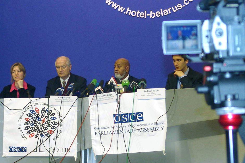 Ambassador Geert Ahrens (C), Head of the ODIHR long-term observation mission, and Alcee Hastings (R), president of the OSCE Parliamentary Assembly, deliver the results of the OSCE observation of the Belarus presidential election in Minsk, 20 March 2006.