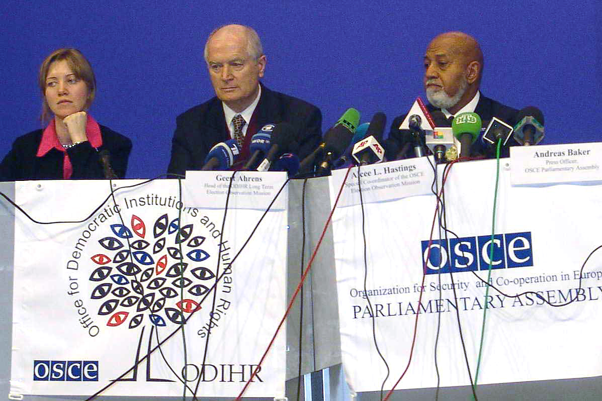 Amb. Geert Ahrens (Left), Head of the ODIHR long-term observation mission, and Alcee Hastings, president of the OSCE Parliamentary Assembly, deliver the results of the OSCE observation of the Belarus presidential election in Minsk, 20 March 2006.
