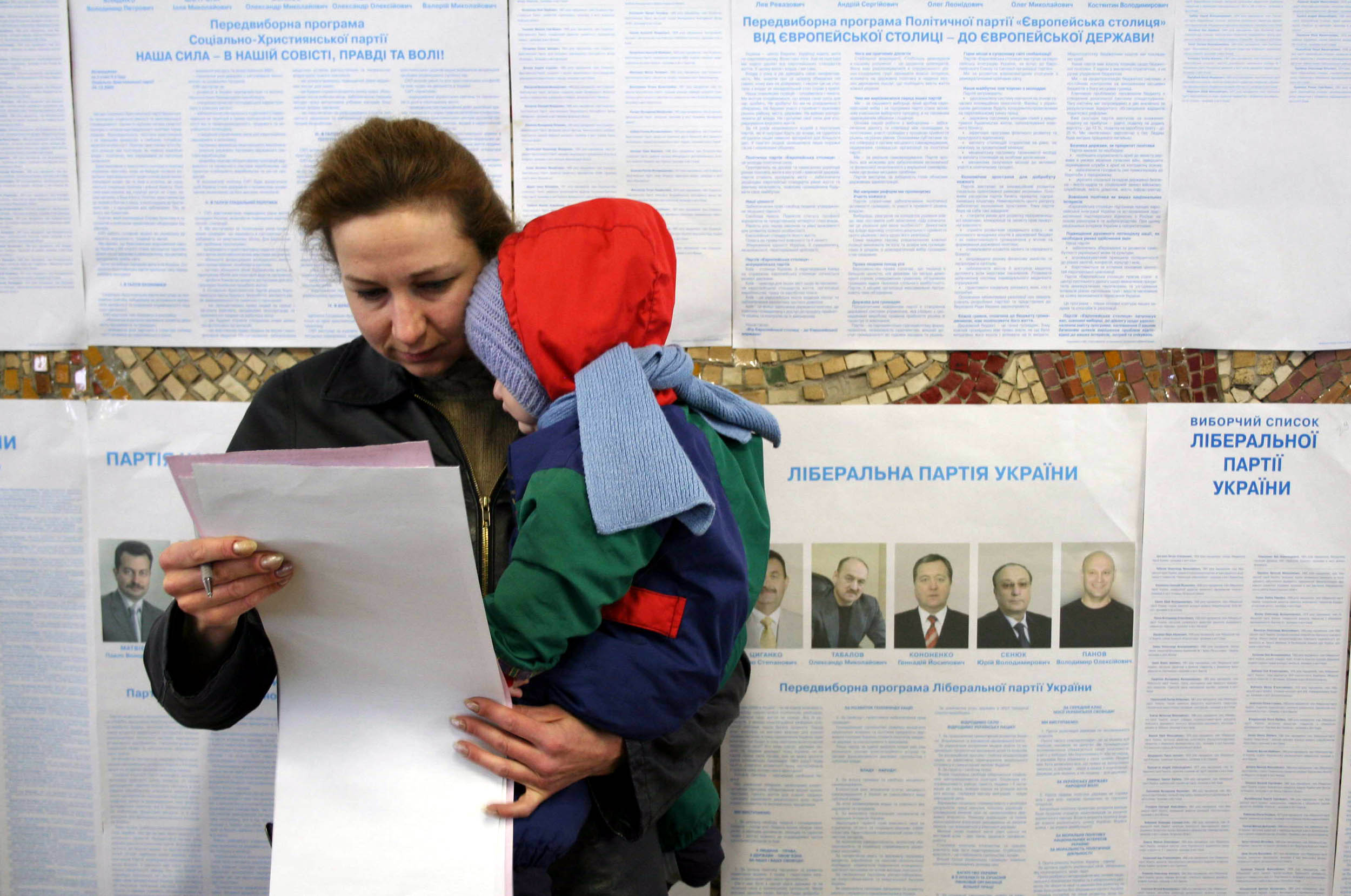 A woman holds a child as she reads a ballot during the Ukrainian parliamentary elections, in Kyiv, 26 March 2006.