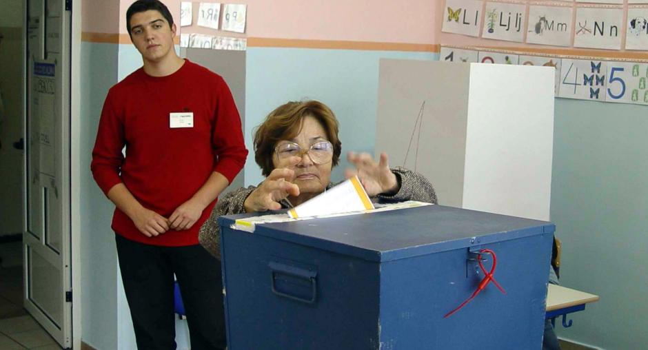 (OSCE)A voter in Sarajevo casts her ballot in the municipal election in Bosnia and Herzegovina on 2 October 2004.