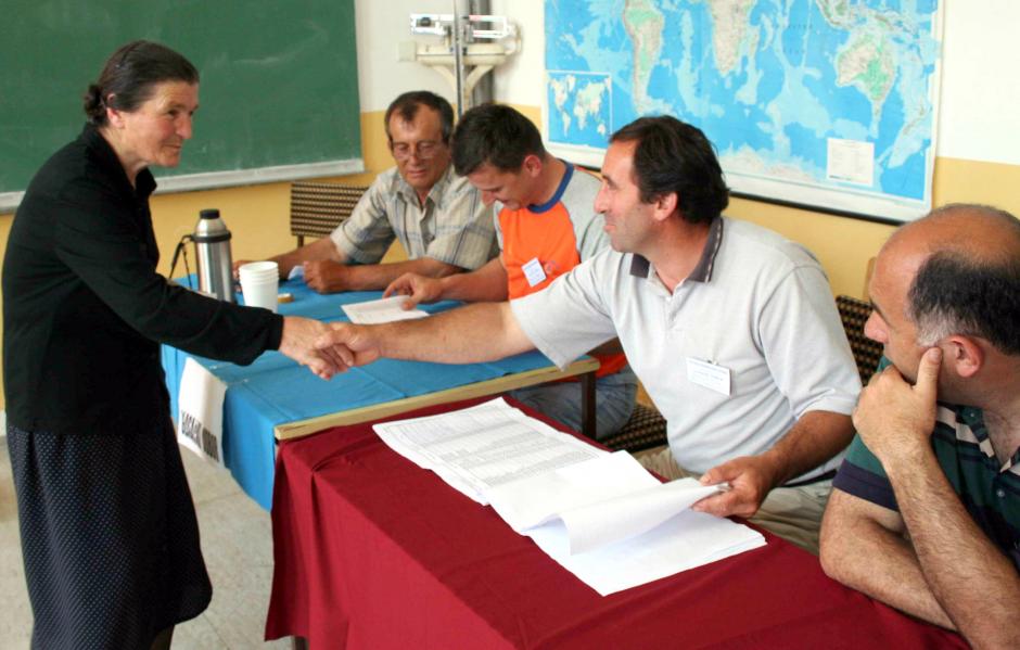 A voter is welcomed at a polling station during a referendum on the future state-status of Montenegro, in the town of Cetinje, 21 May 2006.