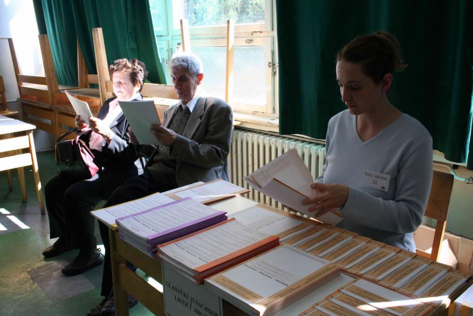 Voters reading ballots at a polling station in Sarajevo during the 1 October 2006 general elections in Bosnia and Herzegovina.