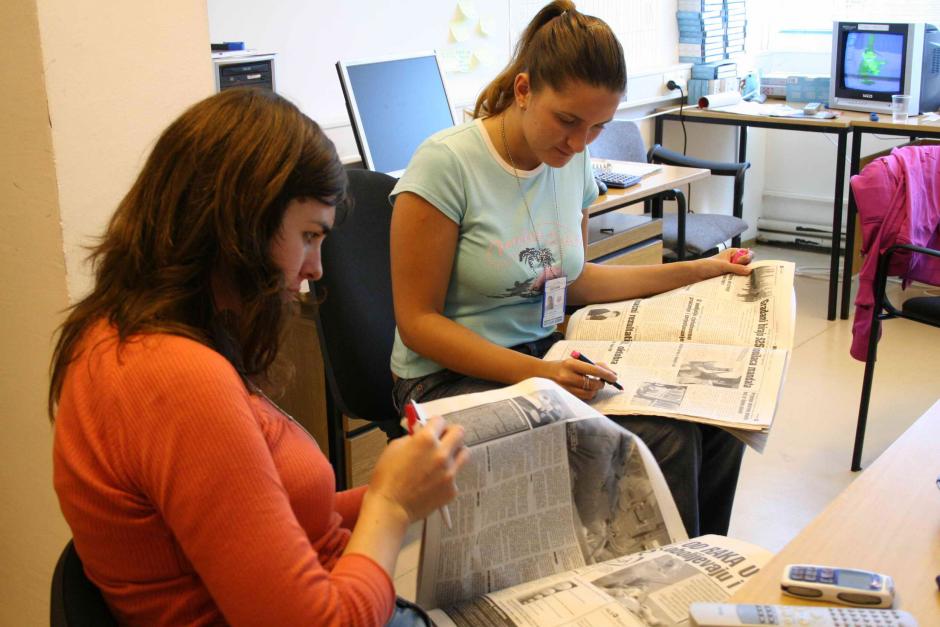 OSCE media monitors read local news papers in their Sarajevo office during the 1 October 2006 general elections in Bosnia and Herzegovina.