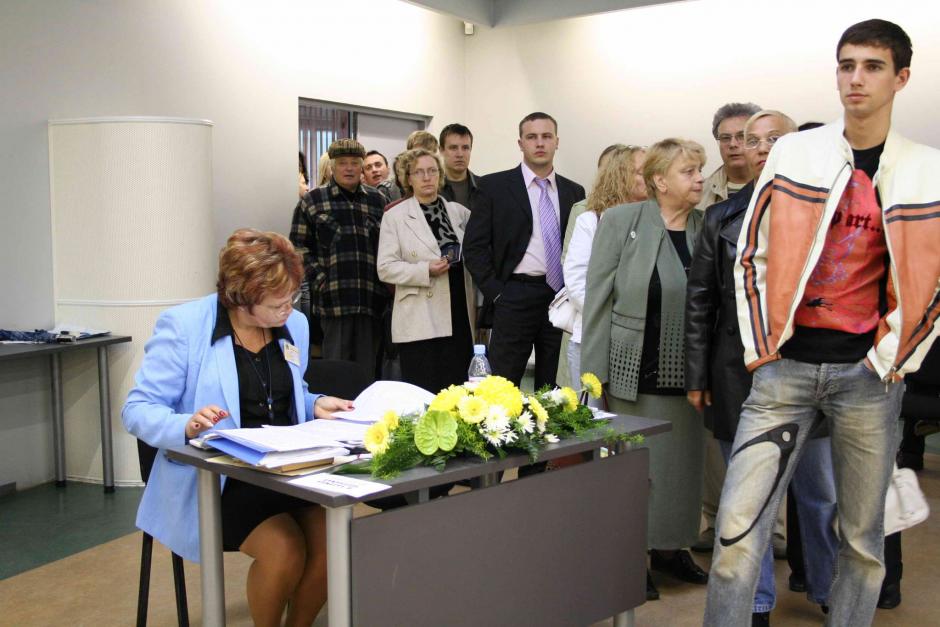 Voters line up at a polling station in Riga during Latvian general elections, 7 October 2006.