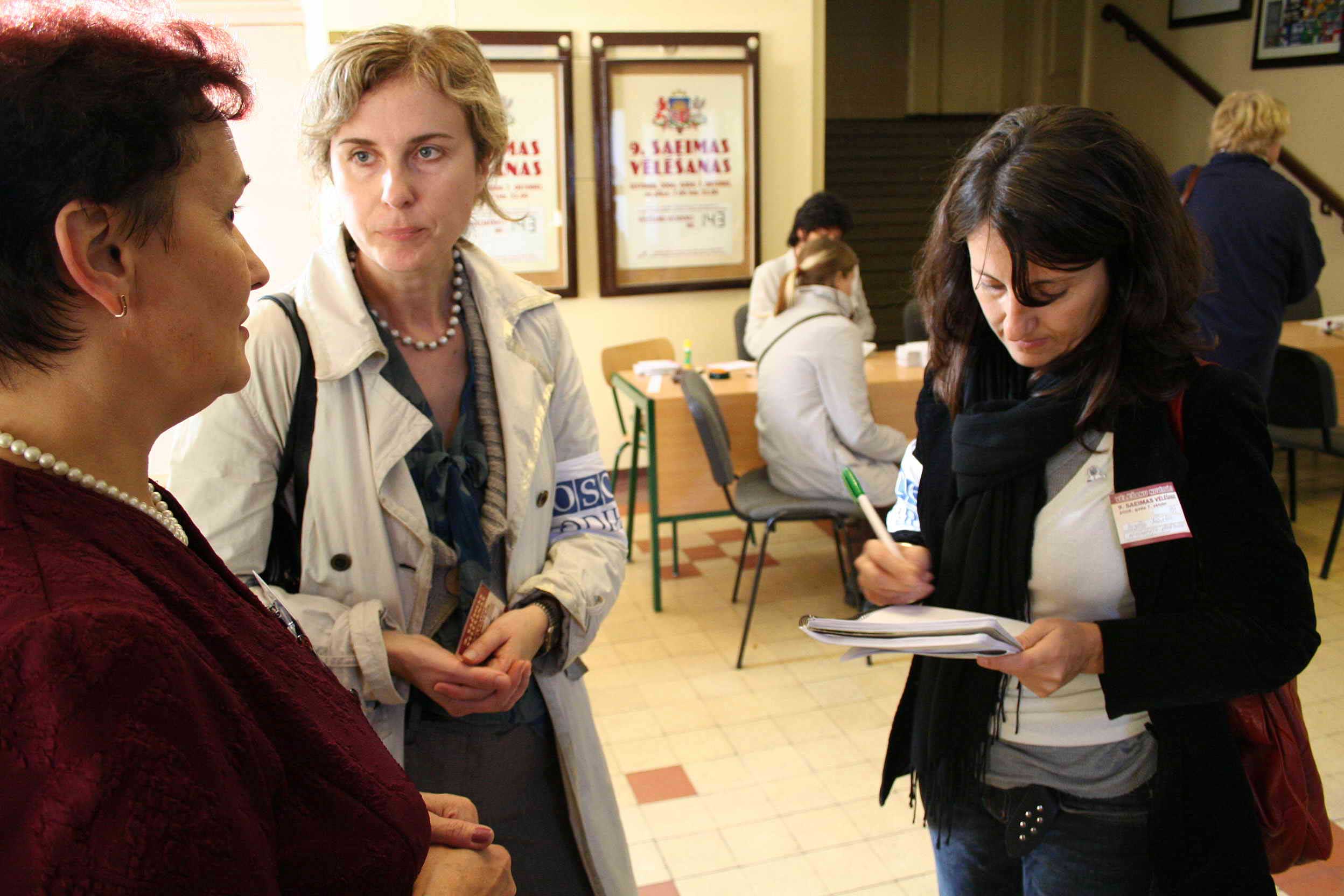 ODIHR election monitors speak to a member of the electoral commission at a polling station in Riga during parliamentary elections in Latvia, 7 October, 2006.