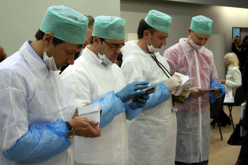 Voters dressed up as doctors to show their support for cuts and changes to the government prepare to vote in parliamentary elections in Latvia, 7 October 2006.