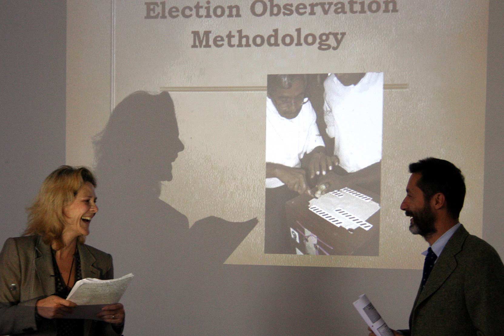 Election experts Delphine Blanchet (left) and Carlo Accame (right) explain the ODIHR's election observation methodology during a training course for short-term election observers, Bishkek, 23 November 2006.