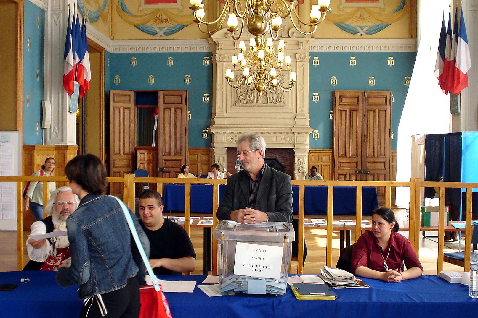 Officials assist a voter at a polling station in Paris during the first round of the French presidential election, 22 April 2007.