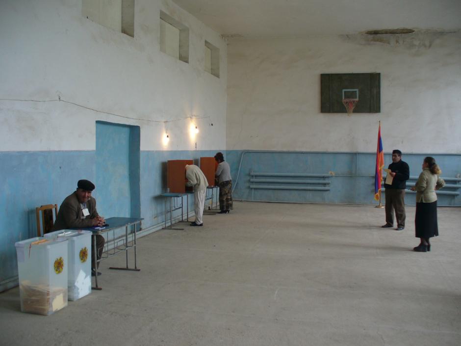 Voters cast their balots at a polling station set up in a school gymnasium, in a mountain village, near Martuni, Lake Sevan, during parliamentary elections in Armenia, 12 May 2007.