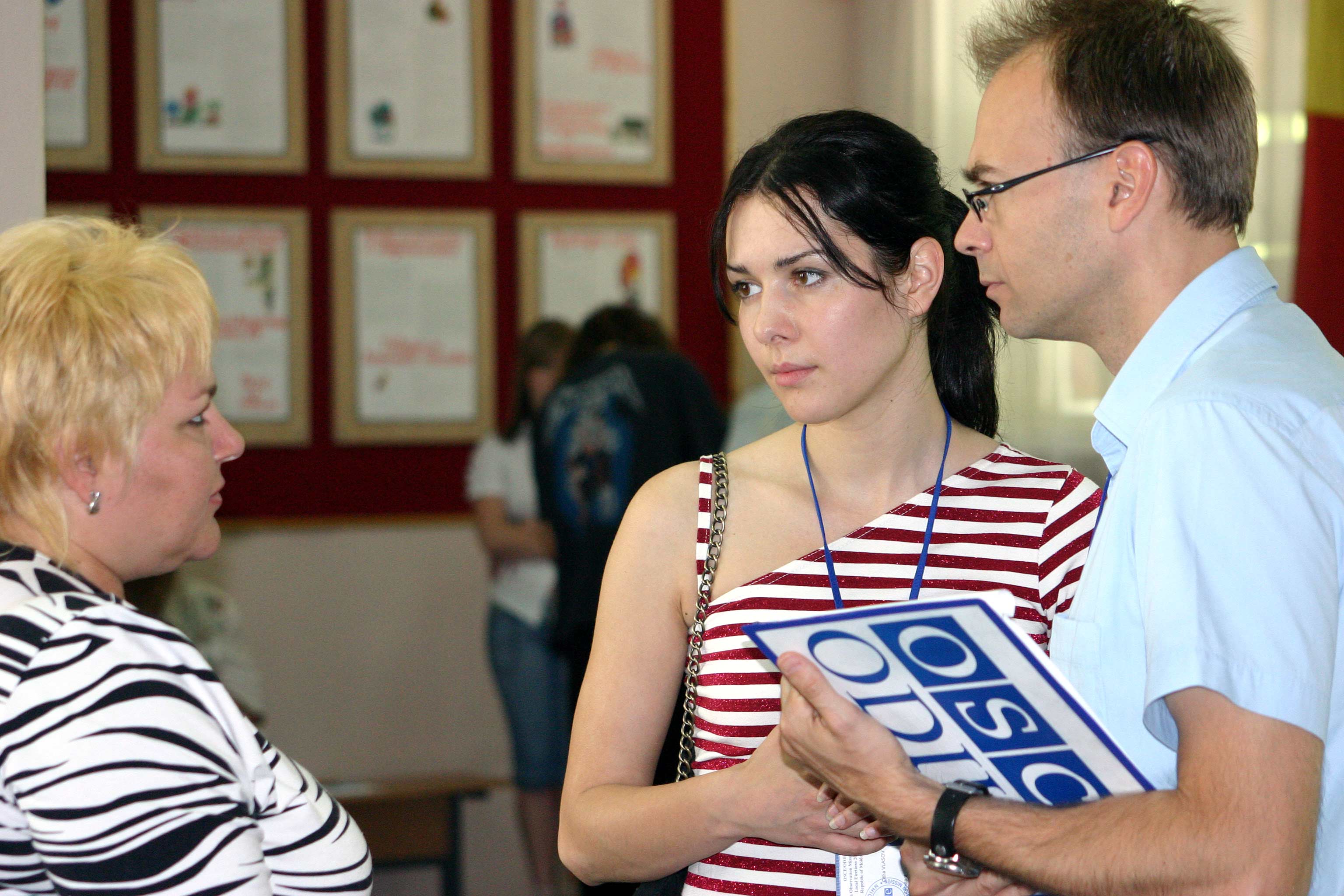 OSCE observers talk to a polling station official during the first round of local elections in Moldova, 3 June 2007.