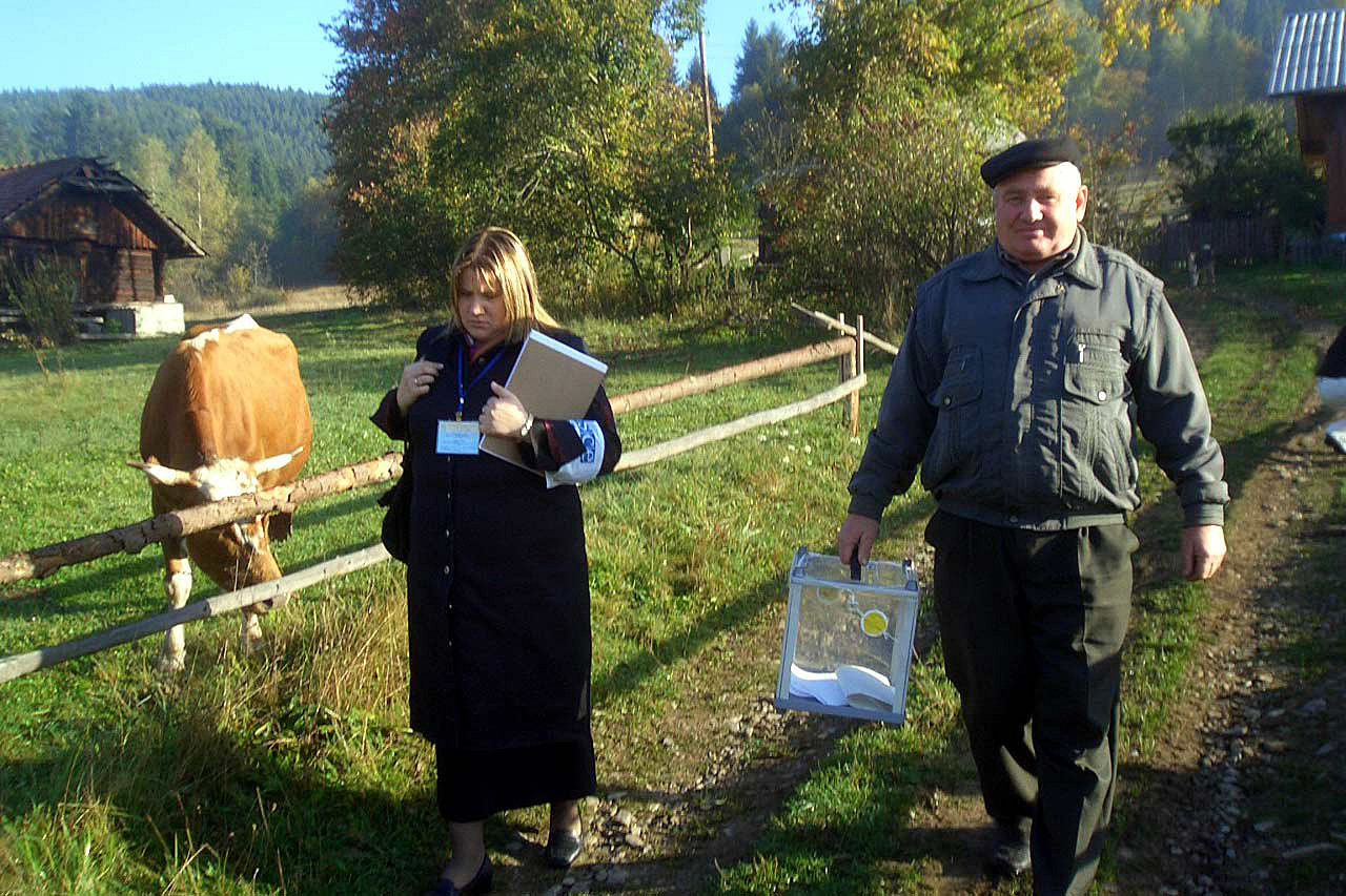 An OSCE election observer (left) accompanies the mobile ballot box in Isaj near the city of Turka during the 30 September 2007 parliamentary elections in Ukraine.