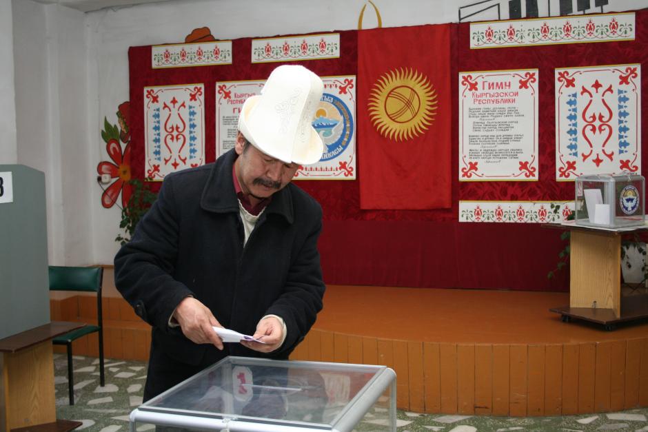 A voter casts his ballot in the town of Kant, Kyrgyzstan, during the pre-term parliamentary elections, 16 December 2007.