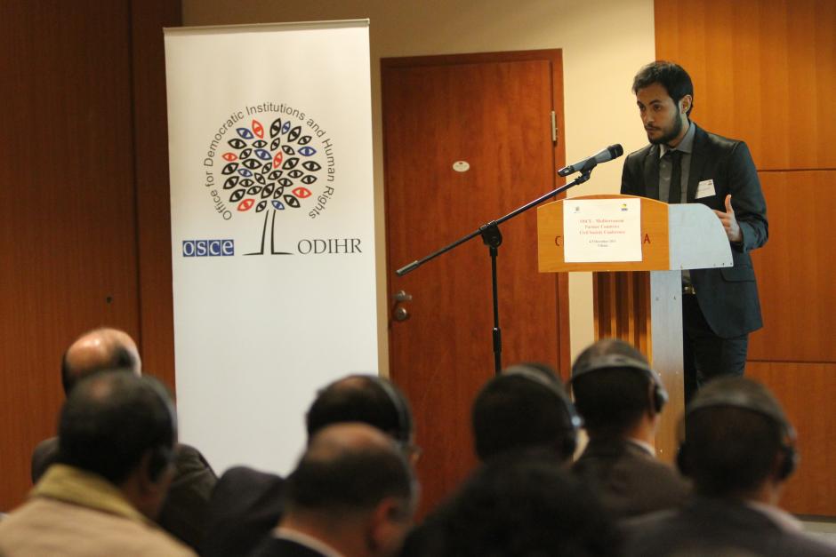 Achref Aouadi, the founder of the Tunisian non-governmental organization, I –Watch, addresses the opening of the OSCE-Mediterranean Partner Countries’ Conference for Civil Society, Vilnius, Lithuania, 4 December 2011.